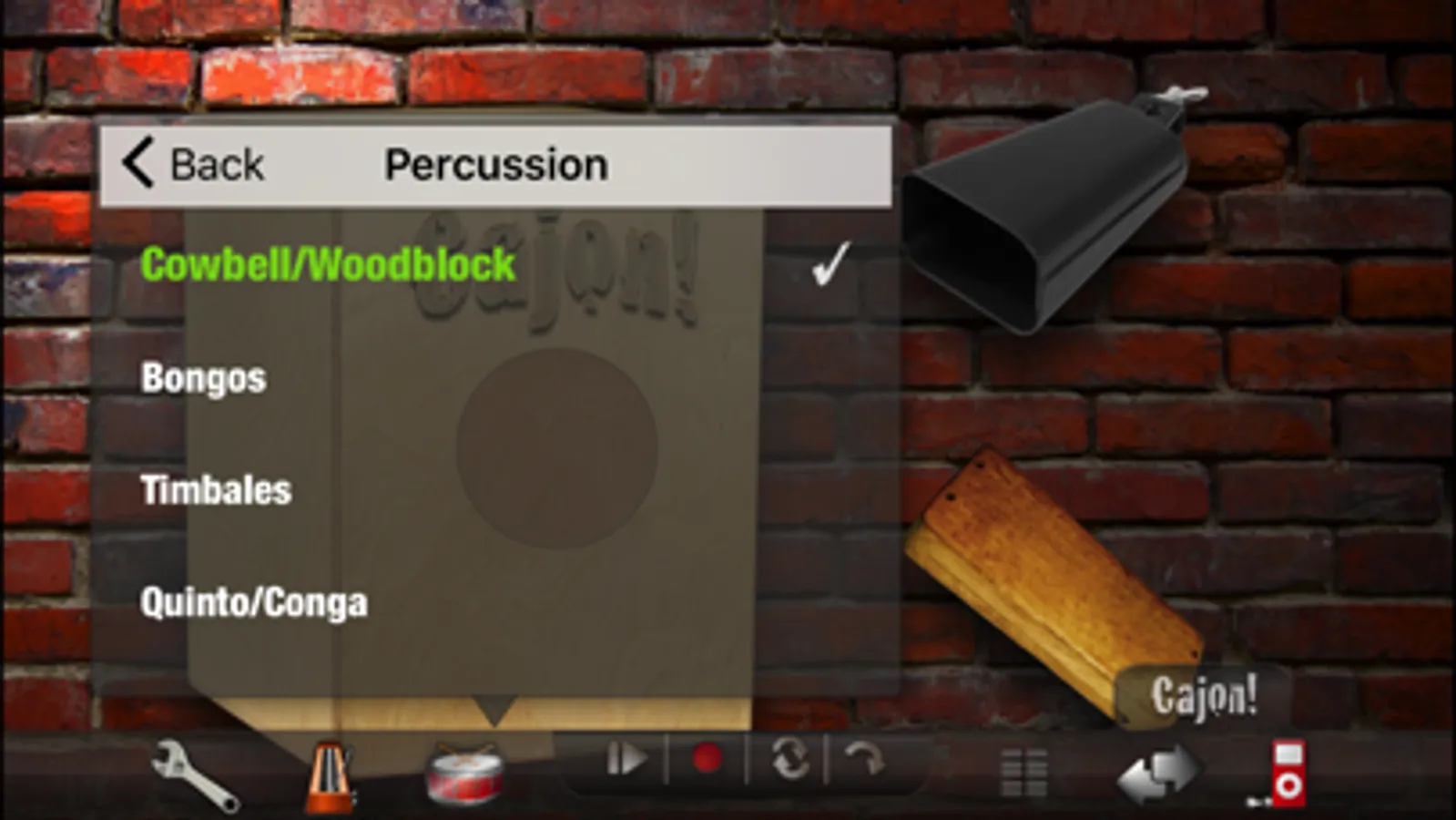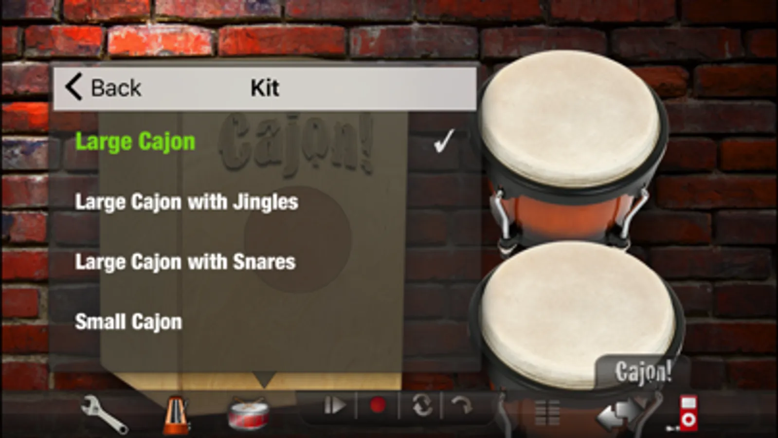 Cajon! Free features 6 different professionally recorded high fidelity cajons to play. You can also add 5 different percussion instruments that can be played along with the cajon including congas, bongos, timbales and more.