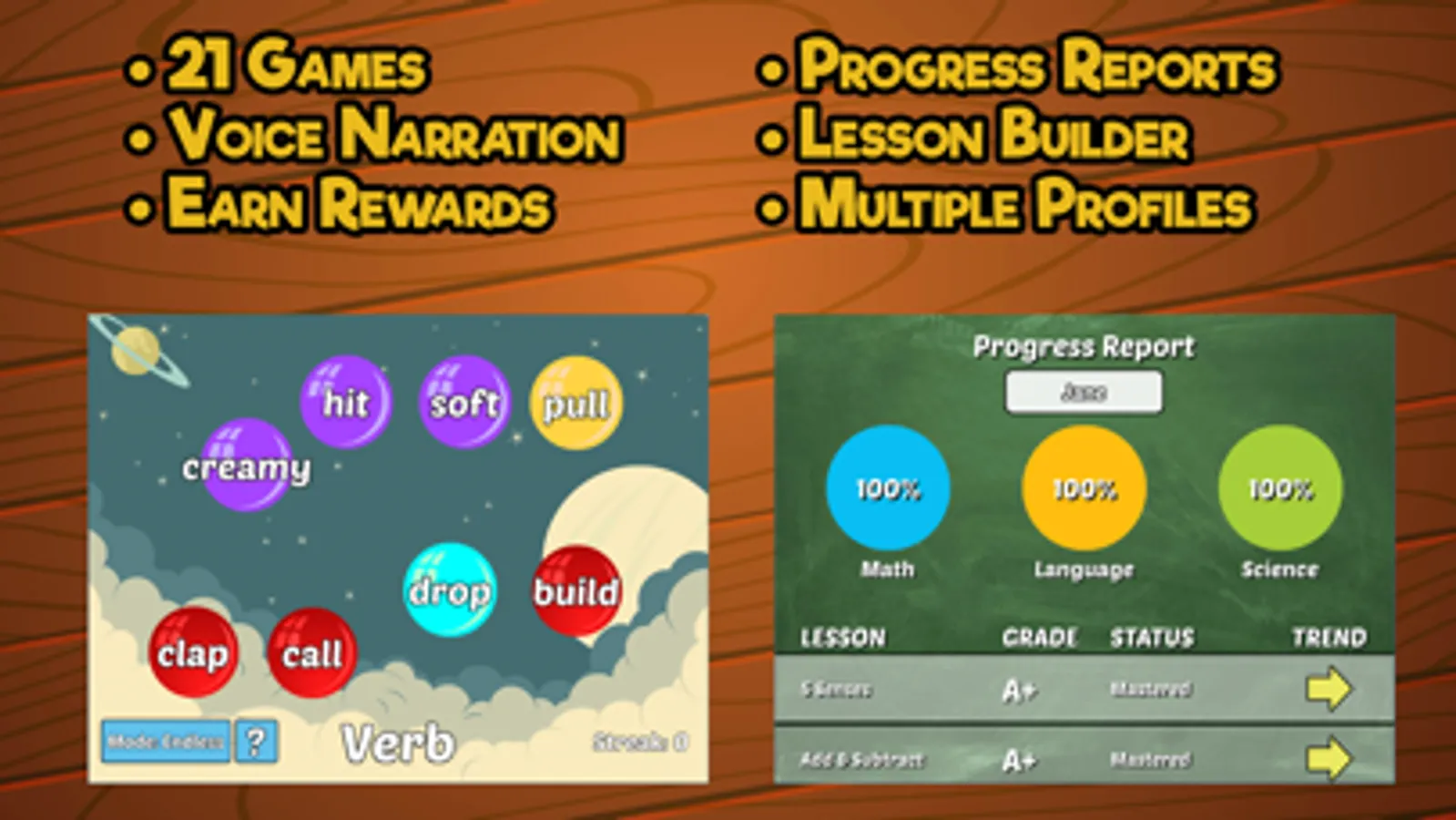 All 21 games are designed using real 1st Grade curriculums and use core curriculum state standards, so you can be sure these games will help give your child a boost in the classroom. Plus your student or child will stay entertained with help voice narration, colorful images and animations, and lots of fun sounds and music. Improve your child's homework with these teacher approved lessons, including science, STEM, language, and math.