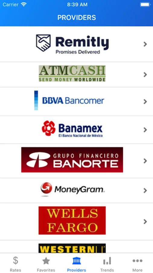 +Bancomer +Banamex +Banco Azteca +BX+ + HSBC +IXE +Bonarte +Xoom +Wells Fargo +Western Union +Moneygram +ATMCash