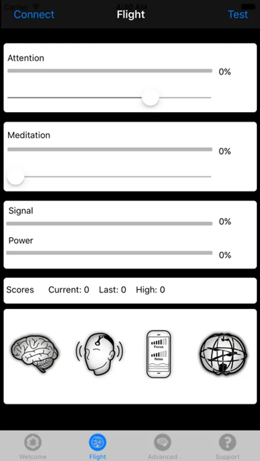 This application connects to a NeuroSky MindWave EEG to read your brainwaves. Target levels of focused concentration ("Attention") and/or mental relaxation ("Meditation") are set using sliders. When you reach your target the Puzzlebox Orbit helicopter will take off. It will continue flying for as long as you maintain your goal.