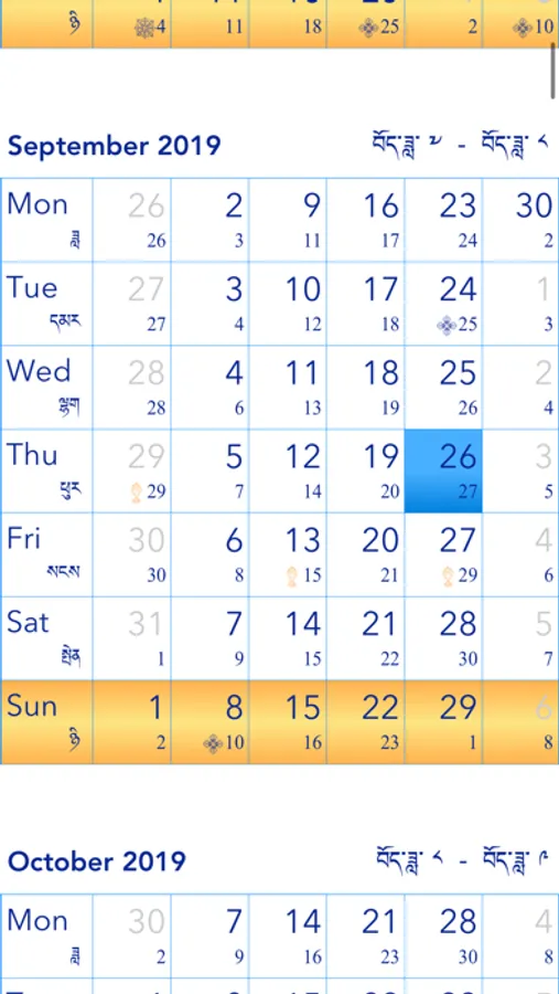 Tibetan lunar calendar combined with Western calendar, specifically designed for practitioners of Tibetan Buddhism: