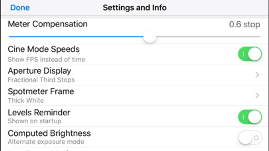 • The light meter shows you your stop as a decimal value (such as f/5.0, good for cameras with EVF iris readouts) or as a full stop and fraction (like f/4.0 ⅔, good for cine lenses with marked iris rings). You can calibrate Cine Meter to match other meters to a tenth of a stop.