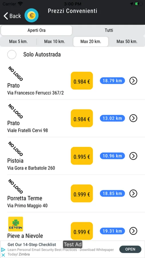 Con la funzione "PREZZI CONVENIENTI", avrai la possibilità di vedere in quale distributore, il metano ha un prezzo più basso. Seleziona la distanza massima entro la quale effettuare la ricerca, rispetto alla tua posizione attuale, e vedrai i prezzi dei distributori nel raggio di 5, 10, 20 o 50 km da te. Seleziona poi il distributore prescelto e raggiungilo utilizzando la funzione "AVVIA NAVIGATORE".