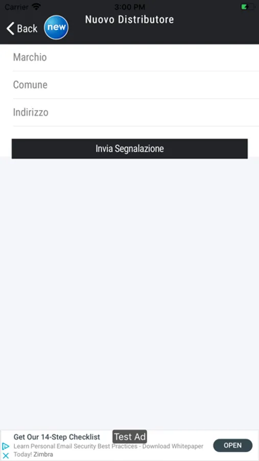 Selezionando la voce "SEGNALA NUOVO DISTRIBUTORE", avrai la possibilità di rendere ancora più completa questa APP. Infatti, è proprio grazie alle vostre segnalazioni che questo strumento può diventare ogni giorno sempre più preciso, aggiungendo nuovi distributori presenti sul territorio.