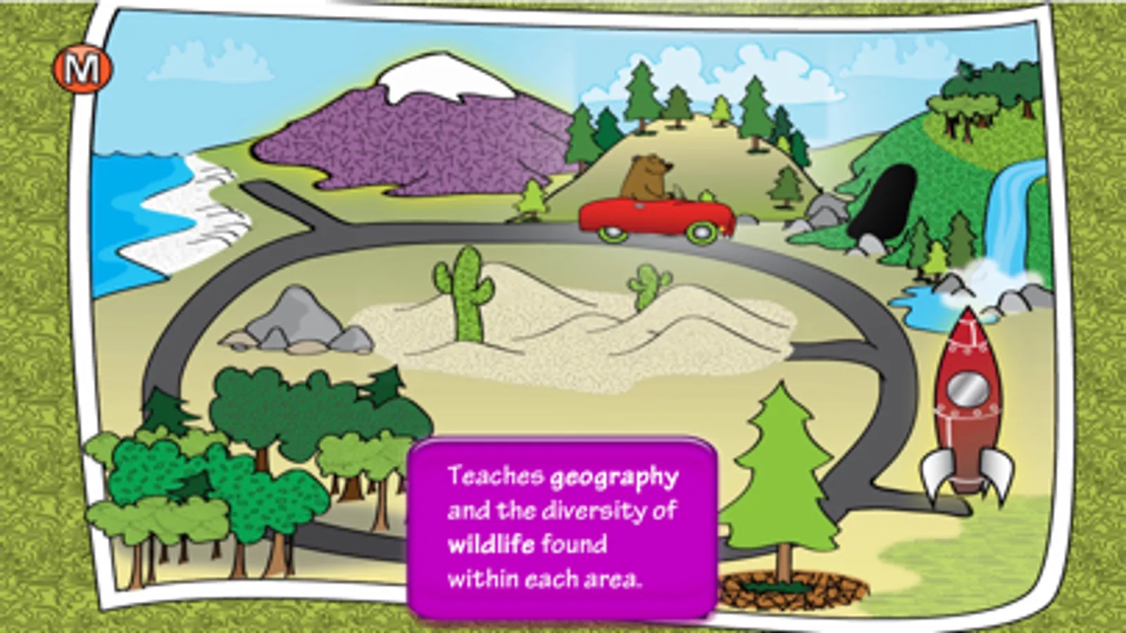Play begins by choosing from a playful map of eight different scenes, each consisting of two pages of interactive, explorable options and characters. Teaching begins with directional words, exploration of geographical differences, and stimulating understanding of habitats of a wide range of wildlife.