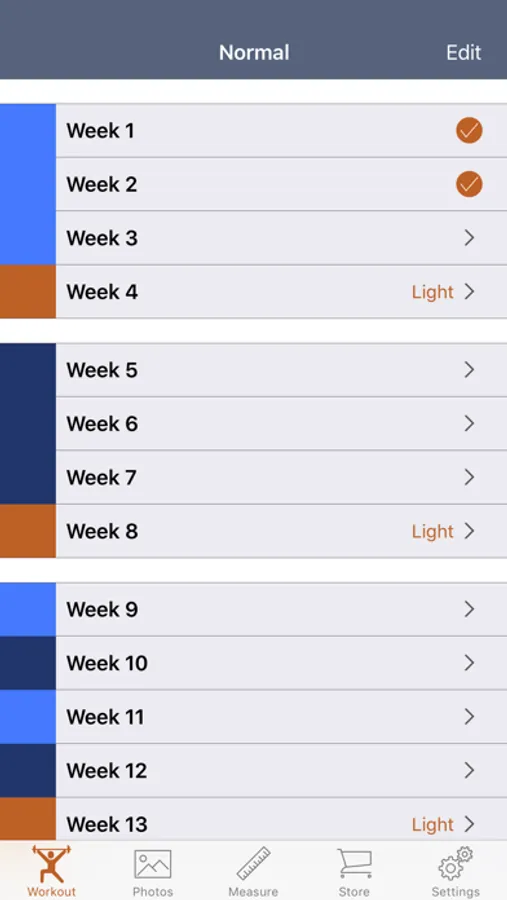 ***You can mark a whole week as complete by long pressing a week cell or by pressing the edit button on the workout list.
