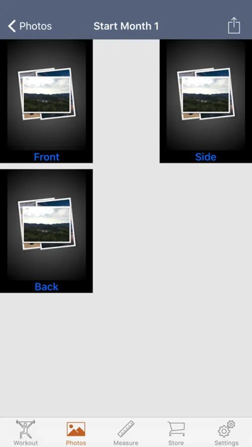 Take monthly photos to visually track your transformation progress over the 90 days. The angles include front, side, and back. Photos can be taken with the internal camera of your device or they can be imported from your photo library. View your photos sorted by all, front, side, or back. You can email them to yourself or friends.
