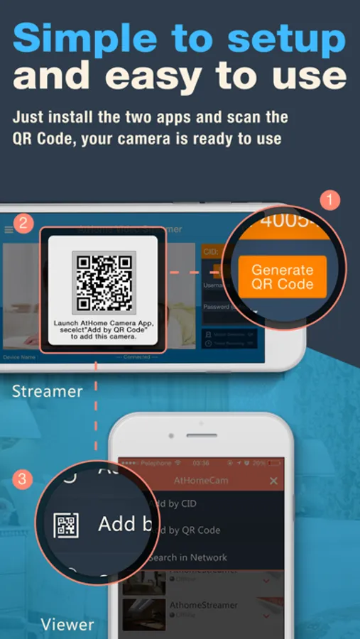 Step 2: Download and install the viewer app AtHome Camera app in device B which you want to use as a viewer. Open the app, sign up and login, select "Add by CID" or "By QR Code" to add a device A, so you are all set to enjoy the live streaming !