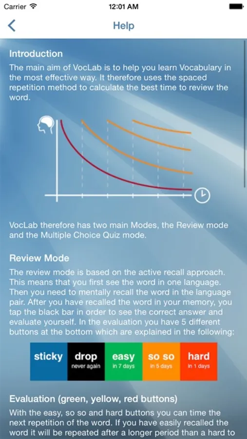 The VocLab algorithm takes care that you always learn words appropriate to your proficiency level.