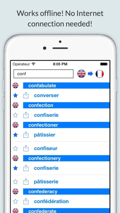 * Works offline! No Internet connection needed, the perfect translator for your trips, your studies, or when no data connection is available.