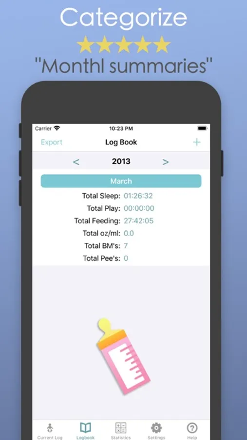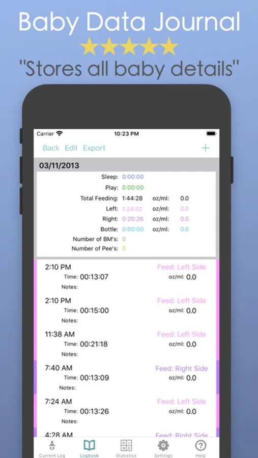 Baby Logger is your daily log to keep track of your baby’s feedings, sleep habits, play times, pee-pee, and bowel movements. Pro version has all features included.
