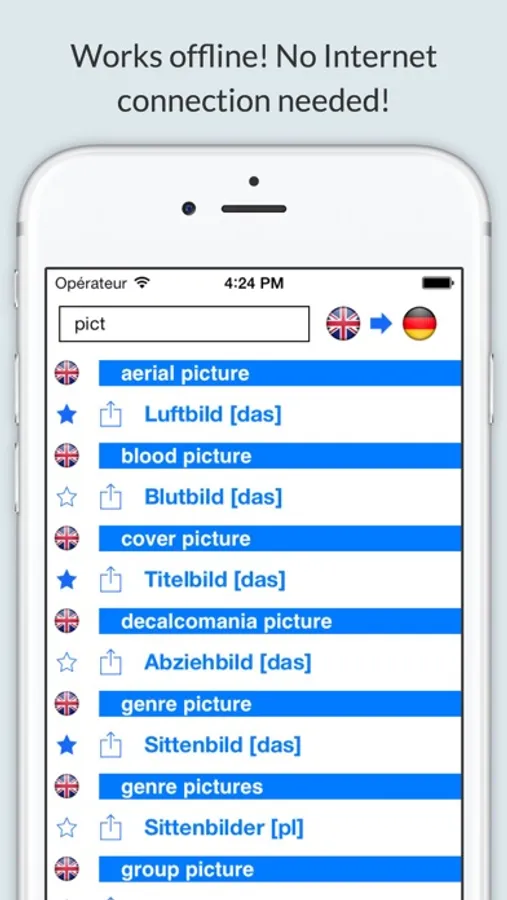 * Works offline! No Internet connection needed, the perfect translator for your trips, your studies, or when no data connection is available.