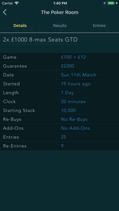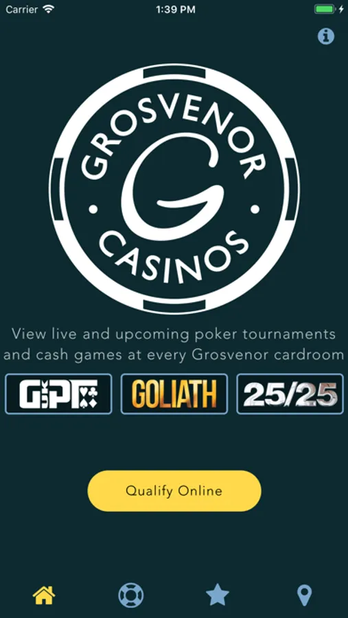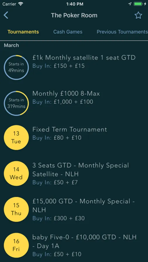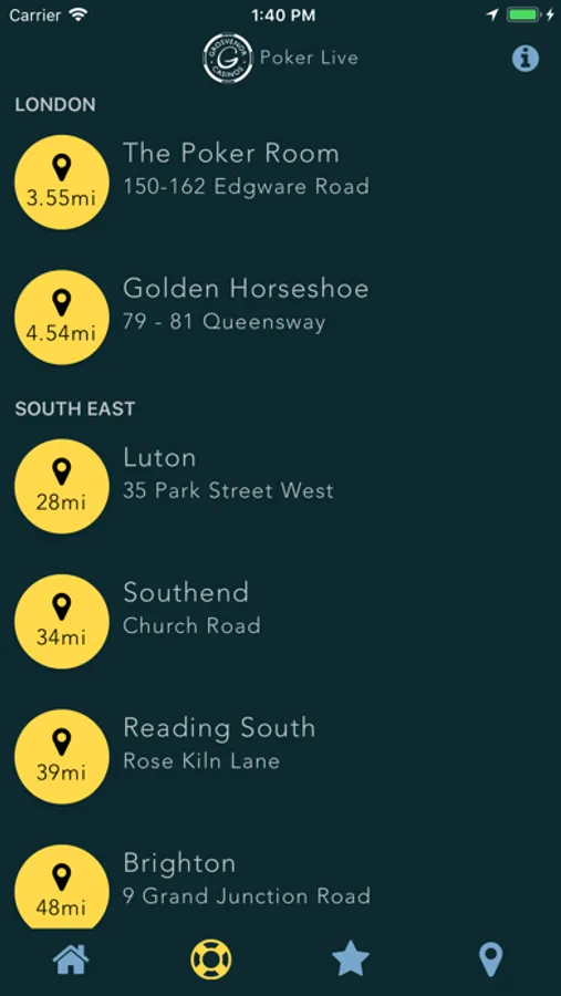 • Tournaments - view a list of current and upcoming poker tournaments at each venue.
