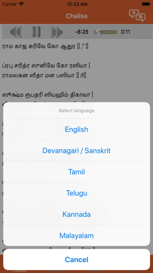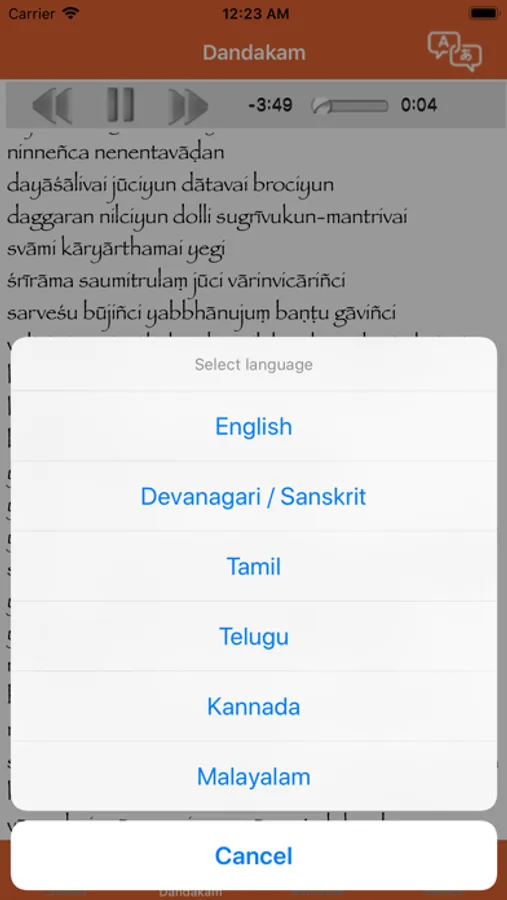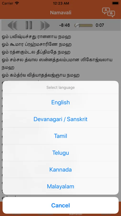 * Lyrics available in English,Thamil ,Sanskrit,Telugu,kannada & Malayalam (User can select different languages for lyrics using Language icon in the top right corner)