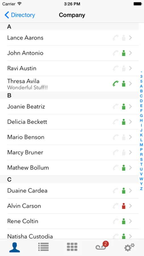 - Presence indicator shows users the status of other system users: green for available, red for busy, yellow for ringing, and blue for dialing