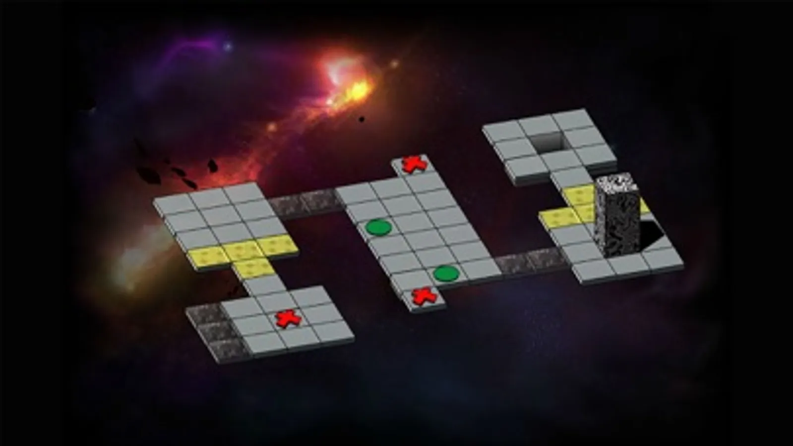 7) Finally, there is a third type of switch shaped like this: ( ) It teleports your block to different locations, splitting it into two smaller blocks at the same time. These can be controlled individually and will rejoin into a normal block when both are places next to each other.
