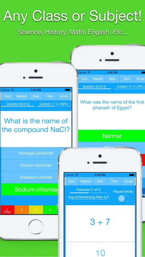 Our questions and flashcards also offer a unique rating system which allows you to assess your understanding of the question/flashcard. Using this system you can focus on the questions/cards you need the most work with. Our questions and flashcards have an option for a hint/notes or more information after the question is answered.