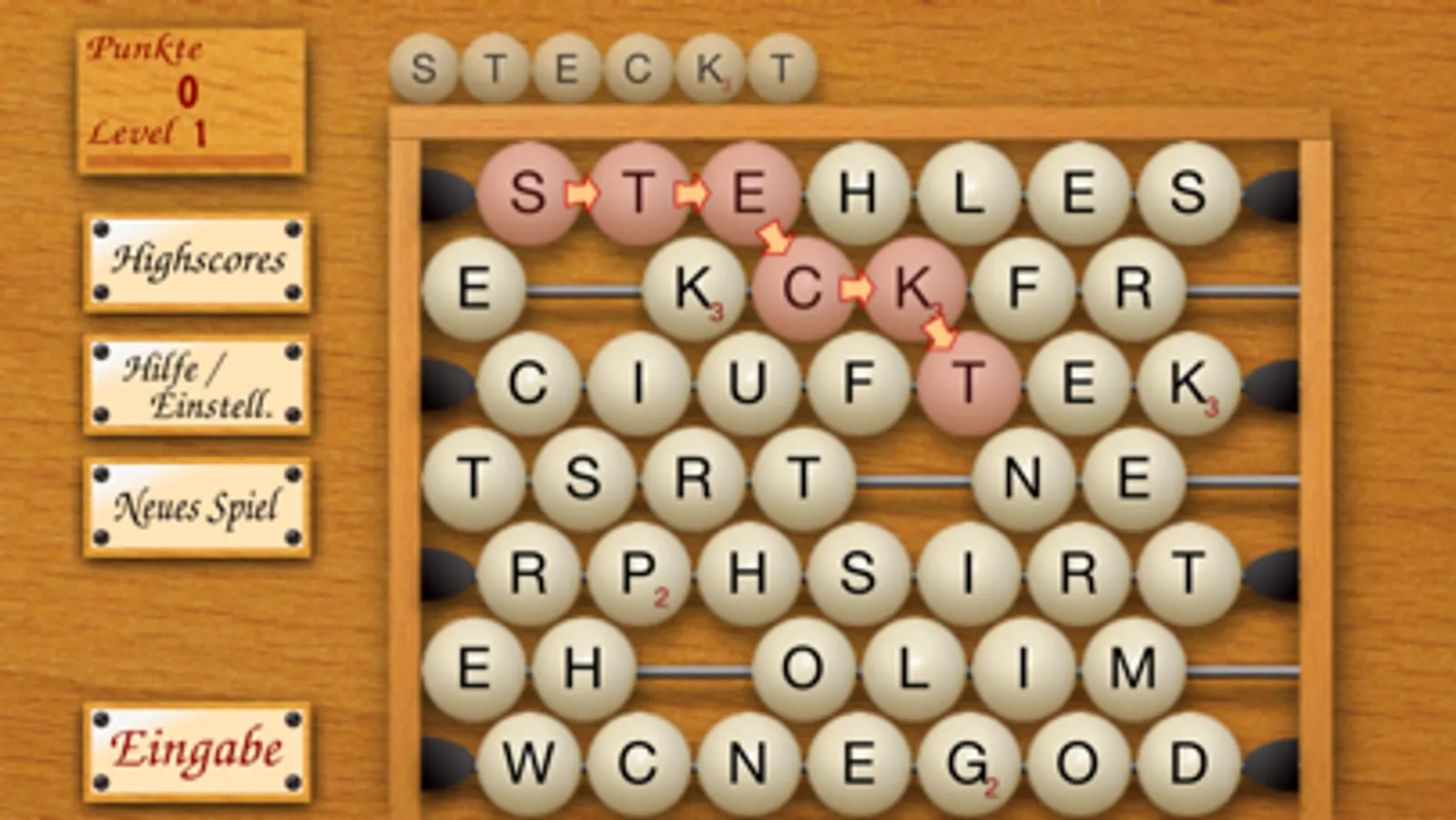 Test your word pool in this addictive word puzzle game! Find German words by linking adjacent letter beads left, right, up, or down. Shift the letter beads like an abacus to increase word possibilities.