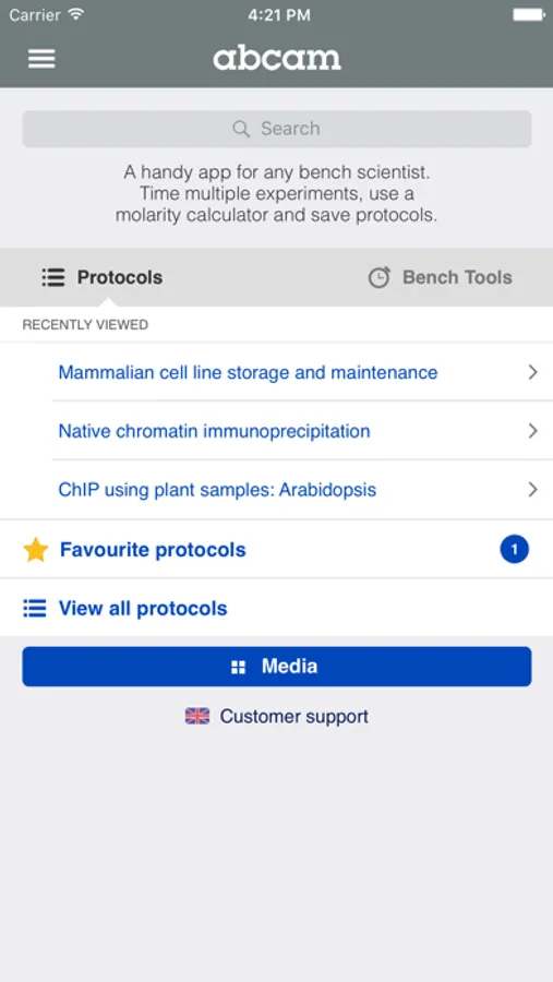 The Abcam app features a suite of tools that are handy for any bench scientist. Time multiple experiments, use a molarity calculator or look up how to run a particular part of an application. Our app was designed to be easily accessible, with all the popular information you need in the palm of your hand. Available on both iPhone and iPad.