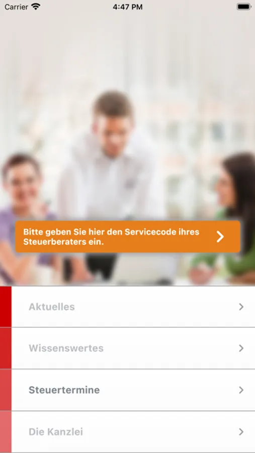 Die vollumfängliche Nutzung der App setzt die Eingabe eines Servicecodes voraus, den Sie von Ihrem Steuerberater erhalten.