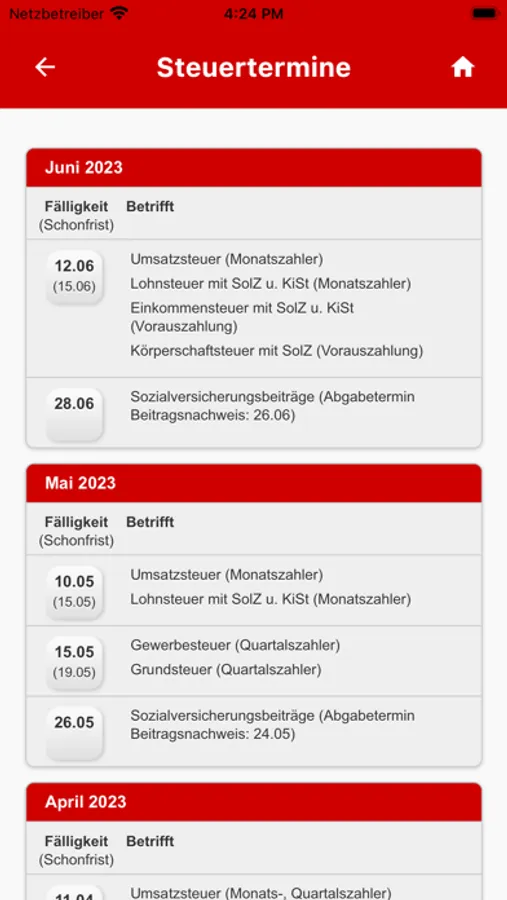 Sie möchten wissen, wann welche Steuerzahlungstermine anstehen? Ob z.B. Einkommen- oder Umsatzsteuervorauszahlung, Lohnsteuer oder Gewerbesteuer, in der App finden Sie die entsprechenden Termine.