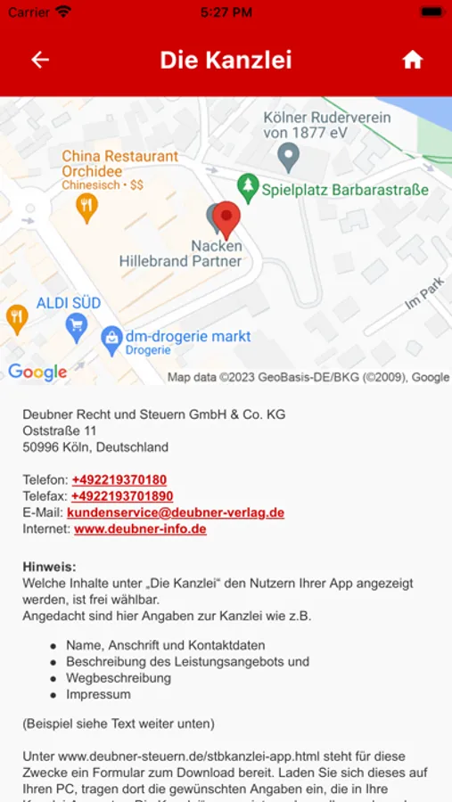 Diese App ist ein kostenloser Service Ihres Steuerberaters. Deshalb haben Sie damit natürlich auch immer einen direkten Draht zur Kanzlei. Sämtliche Kontaktdaten inkl. komfortabler Wegbeschreibung stehen darin zur Verfügung. Sollten Sie Telefonnummer oder E-Mailadresse mal nicht zur Hand haben, schlagen Sie einfach in der App nach.