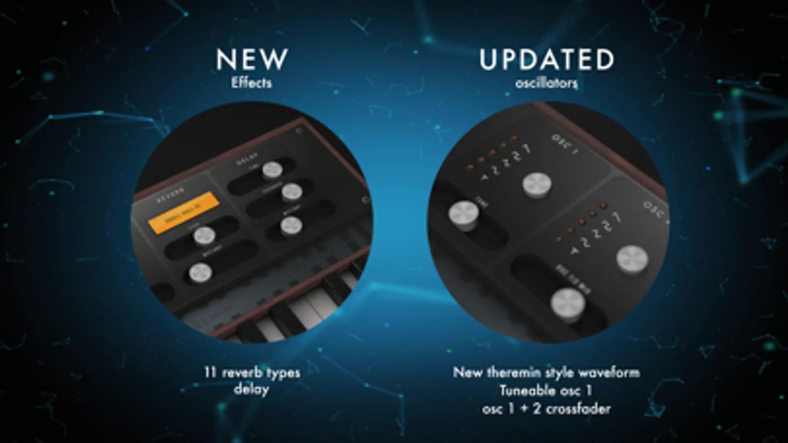 The E Theremin has two oscillators that generate a rich fat analogue tone, with a choice of 5 waveforms (saw, square, triangle, sine and theremin wave) octave shift. The E Theremin can achieve portamento, vibrato and quarter-tones with precise control.