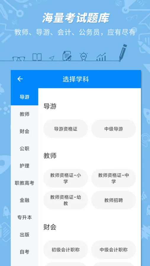 101贝考(原91UP快学堂)是一款覆盖学科广泛,功能丰富全面的手机学习软件。涵盖公务员考试、事业单位考试、教师资格证考试、导游资格证考试、护士执业资格考试、初级会计职称、中级会计职称、银行招聘考试、自学考试、社会工作者、出版资格等多个考试大类海量历年真题与名师授课视频。