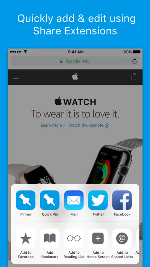 Transfer a bookmark directly between copies of the app running on iPhone & iPad, or send the page to Safari on devices where Pinner isn't installed - including Macs running OS X Yosemite.