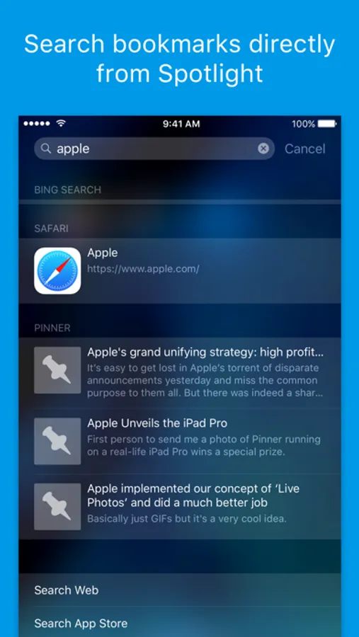 Universal search integration presents Pinner bookmarks alongside web and other app results. Search for a topic and find just the page you wanted, without having to launch Pinner.