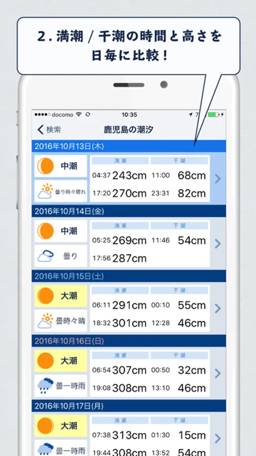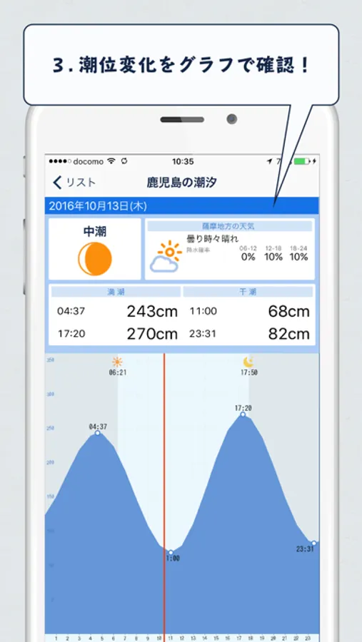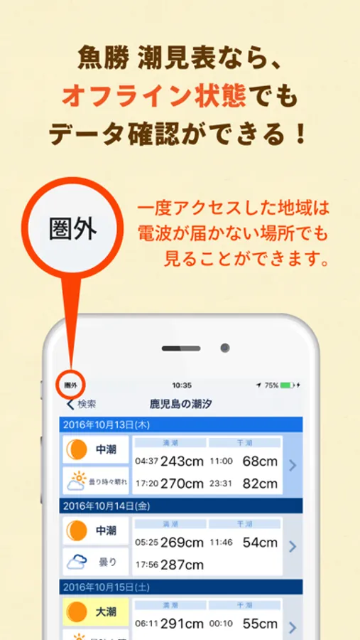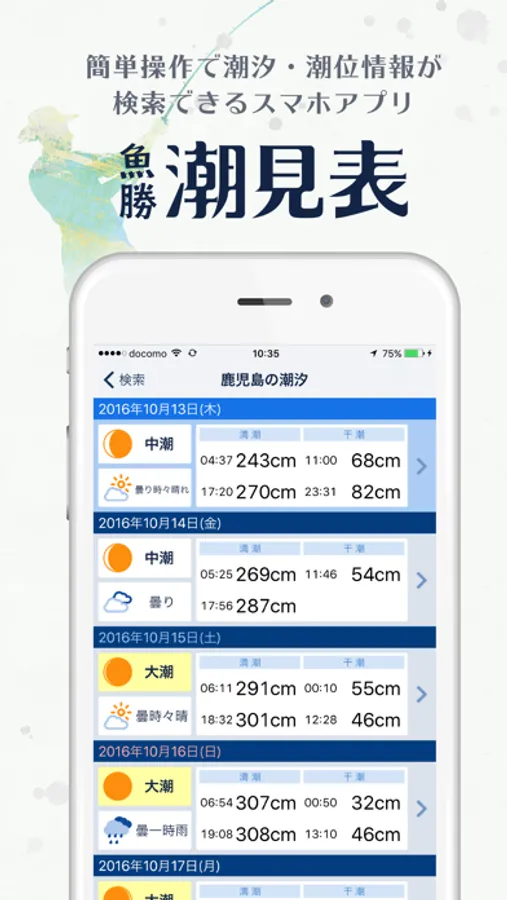 「魚勝 潮見表」は、釣り人に欠かせない、潮汐・潮位の情報を確認するためのアプリで、素早く、満潮・干潮の時間を確認することができます。また、タイドグラフを表示して、さらに詳しくみることもできます。