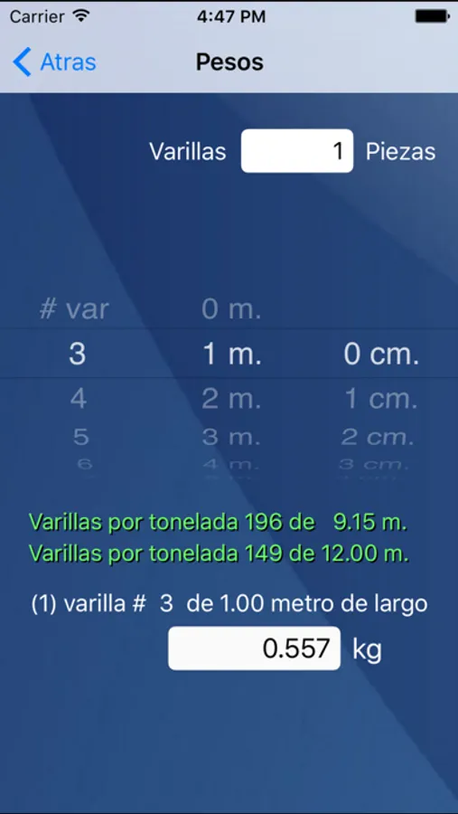 Para su funcionamiento, se selecciona la cantidad de piezas con el número de la varilla expresada en 8vos. de pulgada, se obtienen resultados de varillas por tonelada, equivalencias, que es una ayuda matemática para poder remplazar varillas o empaquetarlas, pero se deberá de tomar en cuenta los Reglamentos y Normas locales de construcción para los arreglos y distribución de acero de refuerzo para secciones longitudinales y transversales.