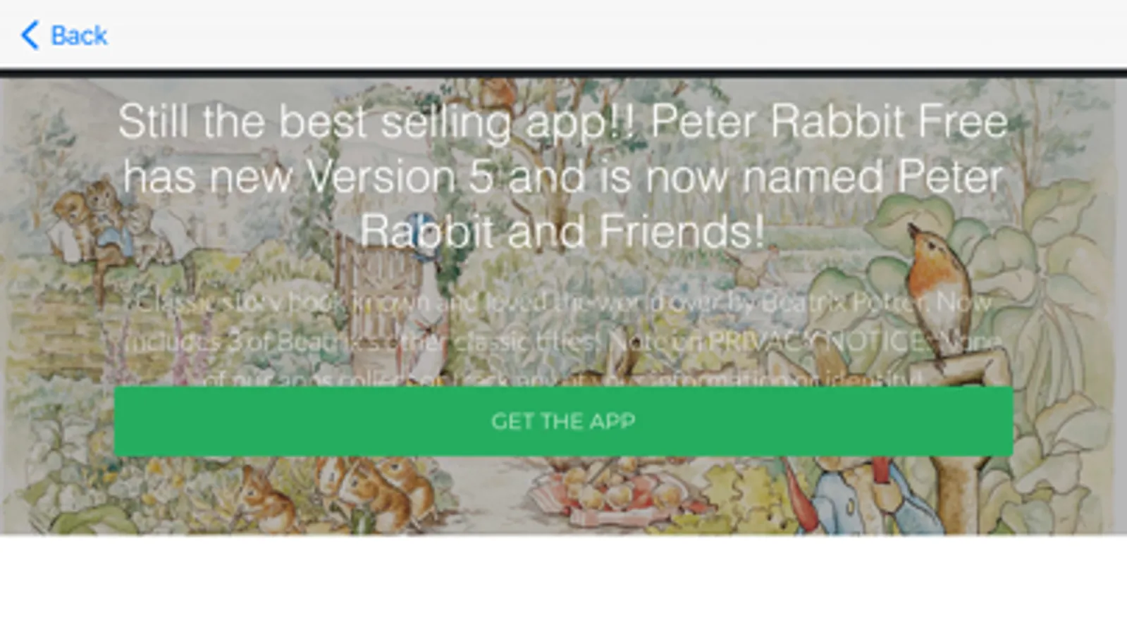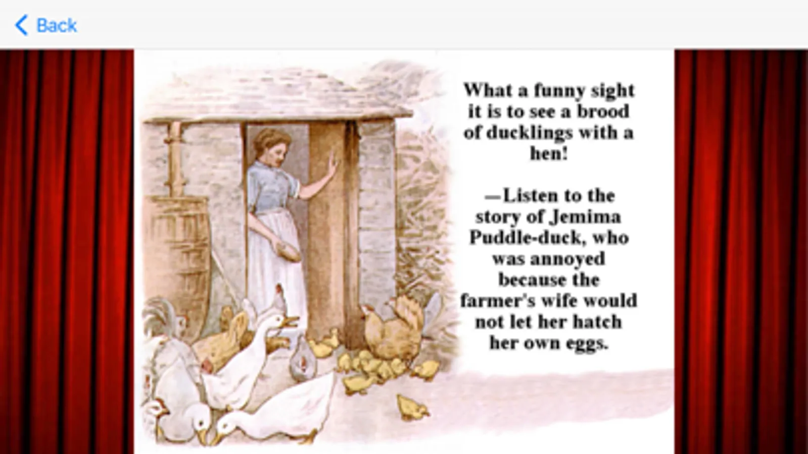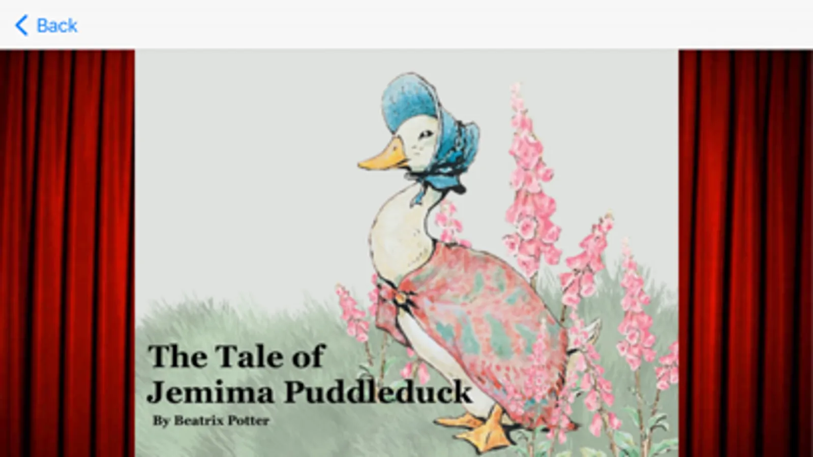 Jemima Puddleduck Free Version another in the series of Beatrix Potter books re-published into a multi-media app. Has background music, "Read to Me" or "Read Myself" modes and optional Activity pages for coloring, printing and sharing. Endearing story of Duck that wanted to have her own ducklings, so set out on her own to find a place to lay and care for her eggs.