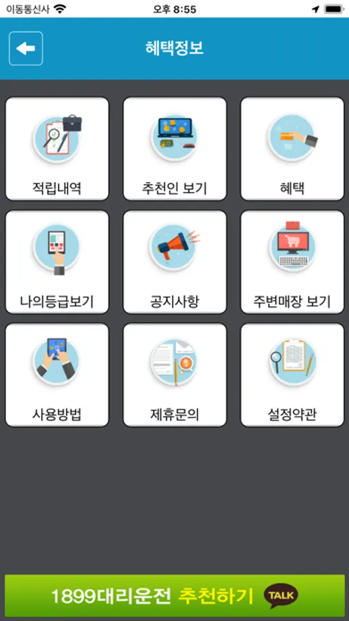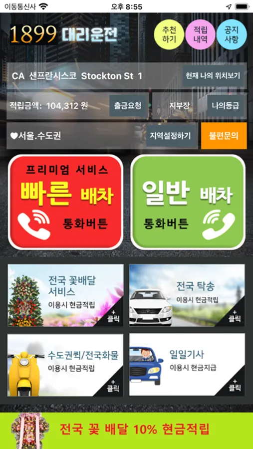 1899대리운전 앱은 , 꽃배달, 퀵서비스, 차량탁송 서비스 이용시 이용금액의 최대13%를 현금적립 해드립니다.