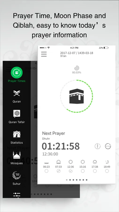 according to your exact place to calculate the local prayer time and accurately show the direction to Mecca, to support prayer time display function without network (GPS), to allows the user to adjust your own prayer time and alarm clock with remind voice base on your current location.