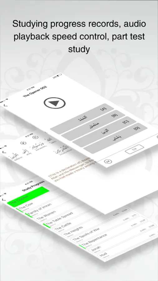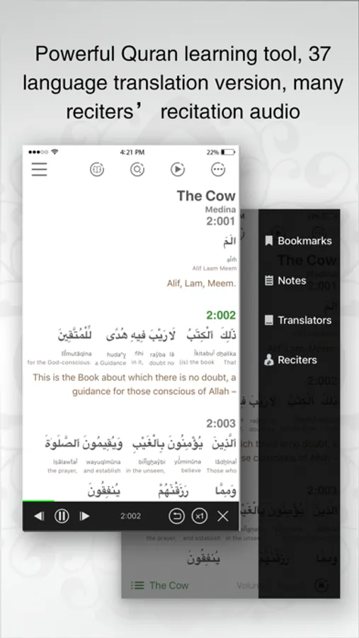 convenient, practical and perfect Quran studying system--- listening, reading, studying, training and testing. To provide accurate studying records, step by step to study and master pronunciation and reading rules of the Quran. To support read speed playback control--- 1X, 1/2,1/4 rate. It contains complete Quran Arabic text from King Fahd Quran Printing Bureau and 37 language Quran translation version.To offer word by word translation version.