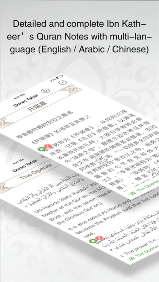 detailed and complete Ibn Katheer’s Quran Notes with multi-language (English / Arabic / Chinese) , to show it in accordance with the paper pattern, to add person comment and bookmarks and other reading experience design, so that user can conveniently memorize it during the entire studying process.