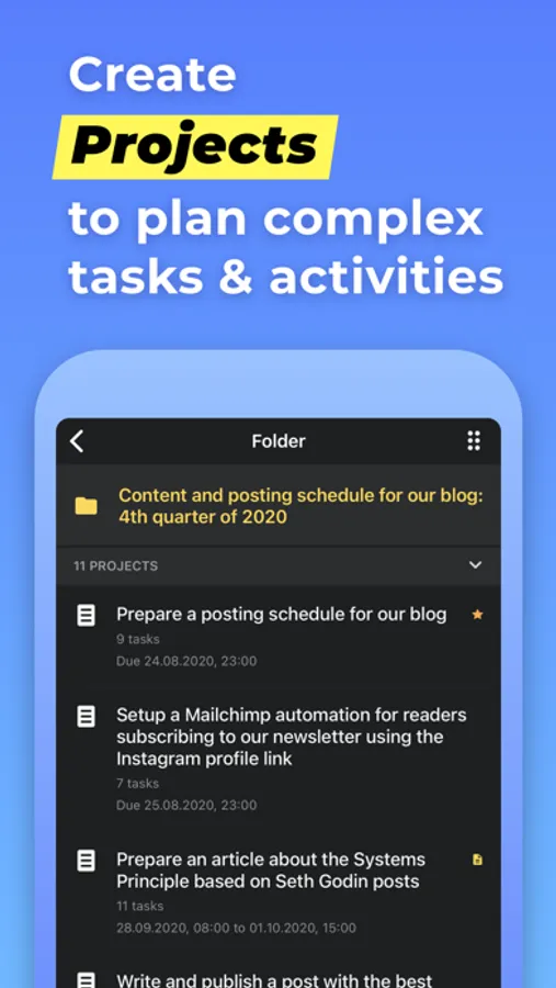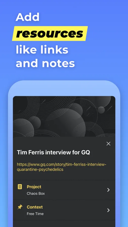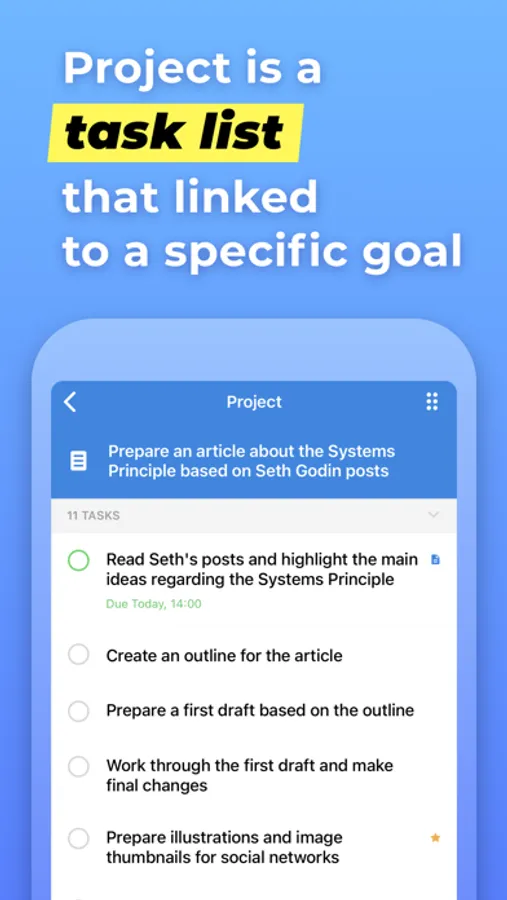 Project is a goal combined with a set of tasks you need to complete in order to achieve it. Create as many projects as you like to write down all the desired outcomes you have