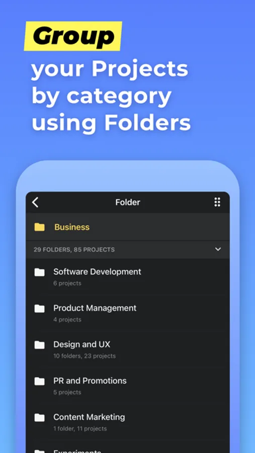 Create unlimited number of projects and group them by category using Folders