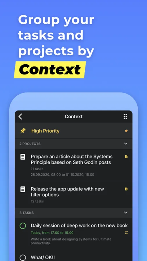 Organize tasks from different projects using flexible context lists. If you are familiar with GTD you would just love this feature