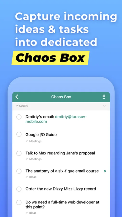 Put all the incoming tasks, notes and ideas into Chaos Box in order to process them later. It works similar to GTD inbox, but you can use it as a simple to-do list