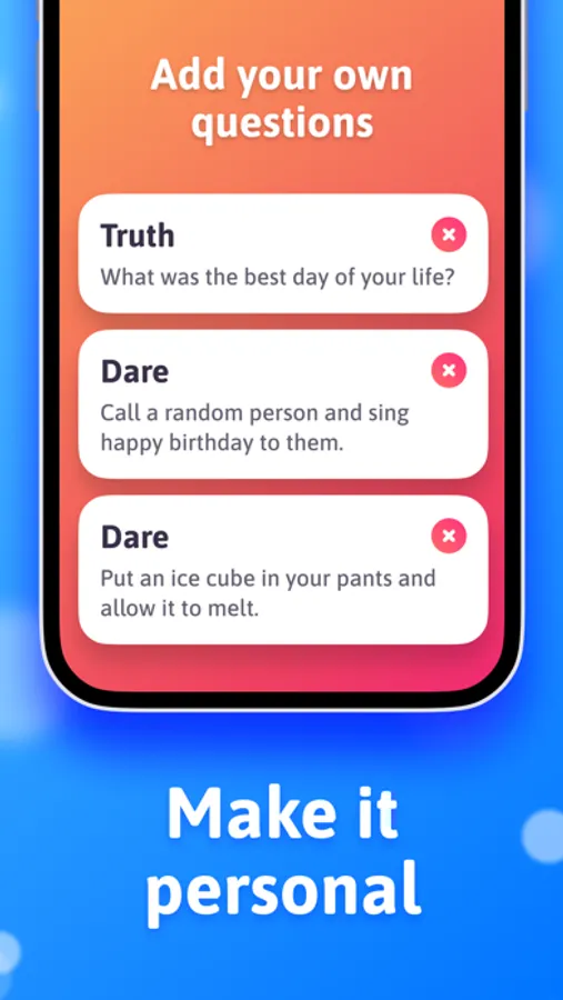 ● Hundreds of original, funny, and challenging Truth or Dares!