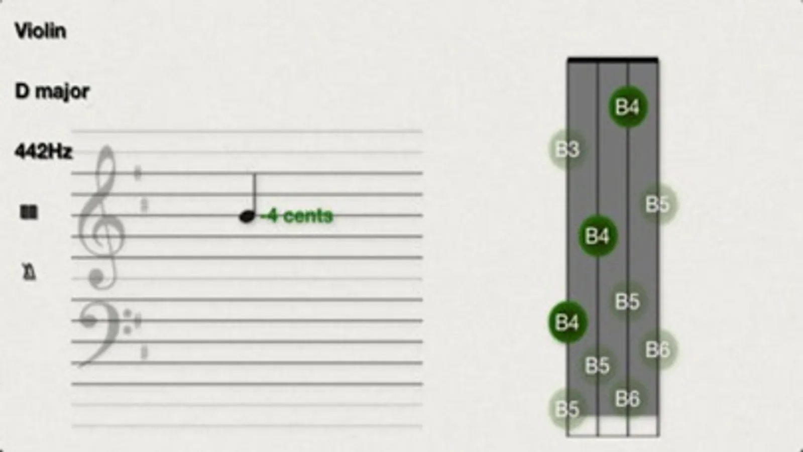 + Circle of fifths and intervals where the last two identified notes are presented in the circle of fifths as well as in the note sheet (with interval size in cents).