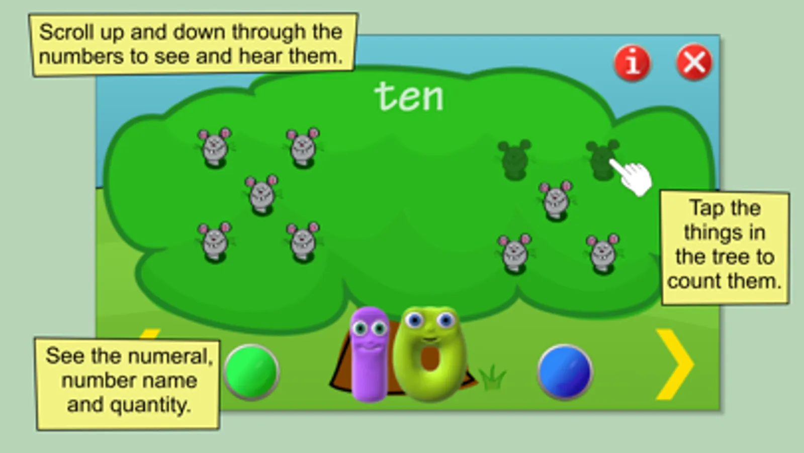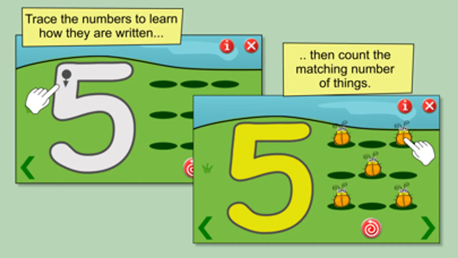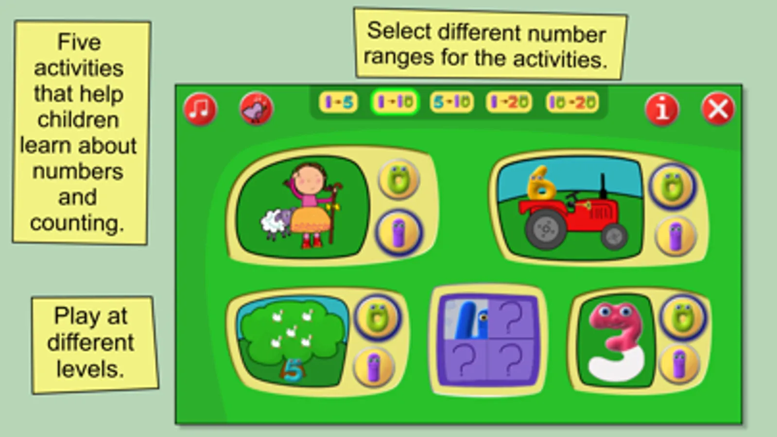 Children love to copy and count along, so the main activities each have a level where the numbers are spoken as items are counted, helping children become familiar with the number names and their order.