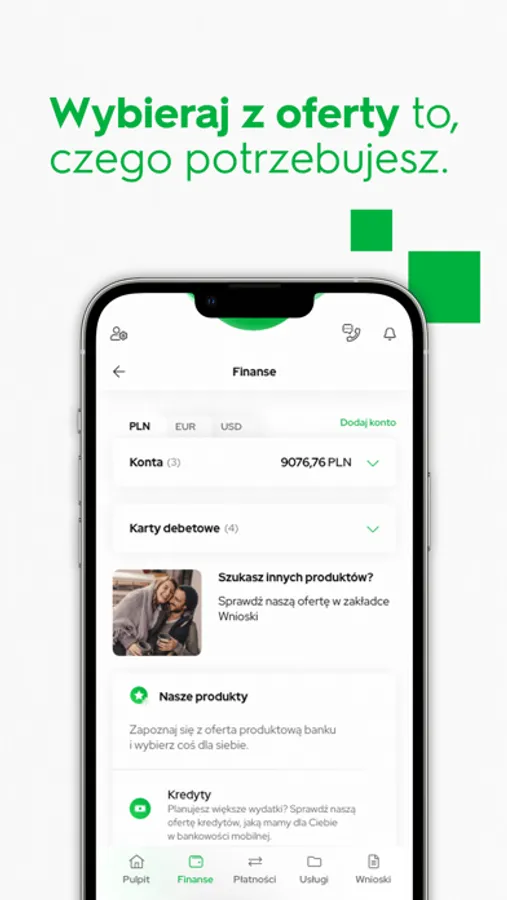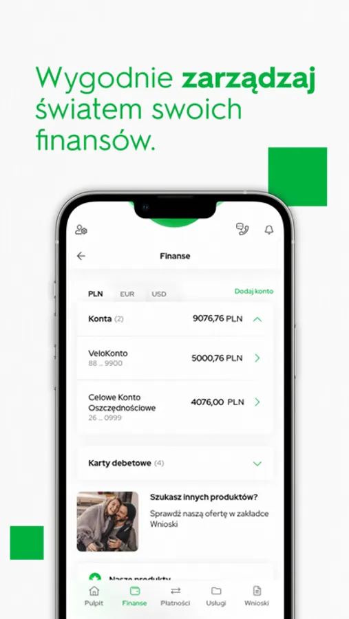 2. Potrzebujesz sprawdzić szczegóły Twoich kont, lokat, kredytów czy kart kredytowych? Wszystko masz pod ręką w zakładce Finanse.