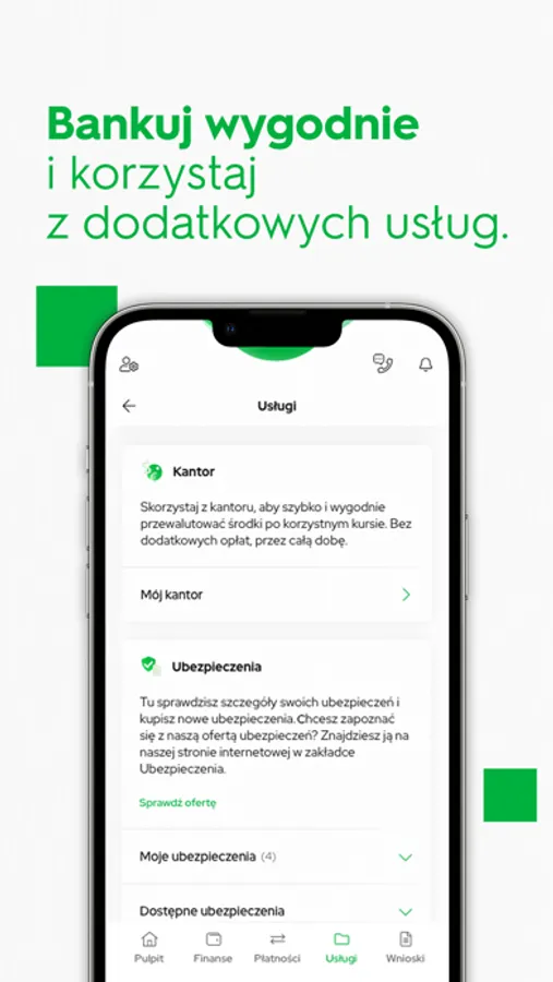 4. Potrzebujesz szybko przewalutować środki po korzystnym kursie? Zrobisz to bez dodatkowych opłat, przez całą dobę w naszym kantorze. Aktywuj płatności mobilne i płać wygodnie telefonem jak kartą zbliżeniową. Chcesz szybko i wygodnie zapłacić w naszej aplikacji za bilet lub parkowanie? Wszystko to znajdziesz w zakładce Usługi.