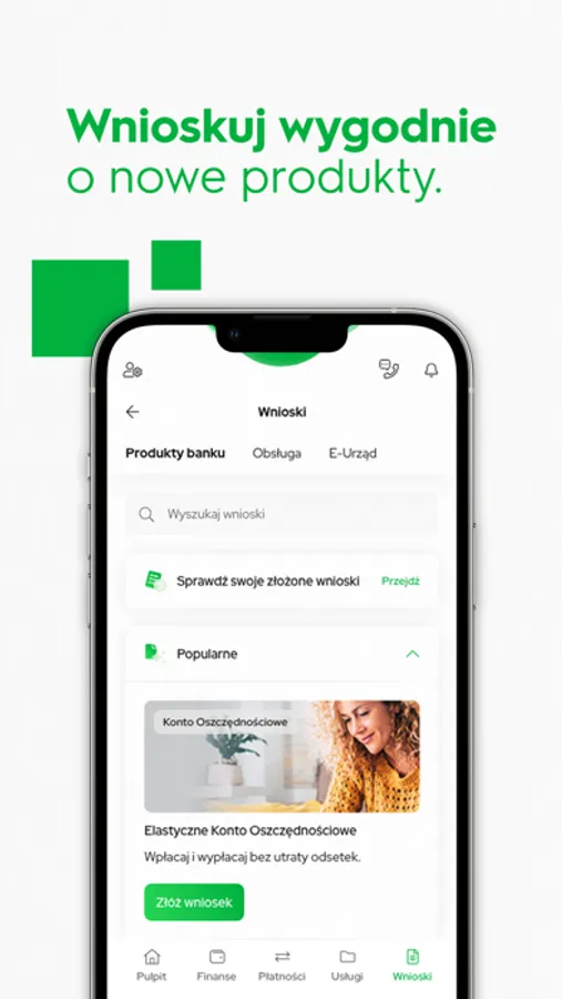 5. Potrzebujesz kredytu lub karty kredytowej? Chcesz otworzyć konto albo lokatę? Sprawdź naszą ofertę w zakładce Wnioski. Możesz tu składać wnioski produktowe lub obsługowe. W każdej chwili sprawdzisz listę złożonych wniosków.