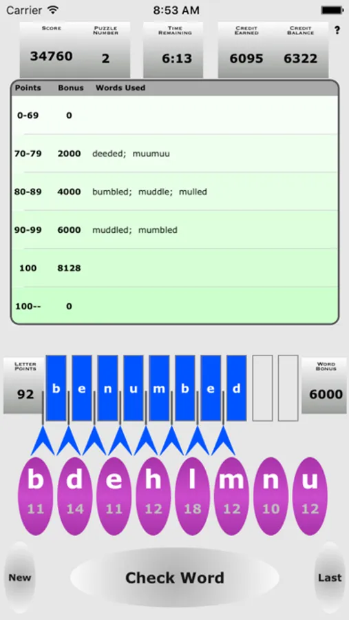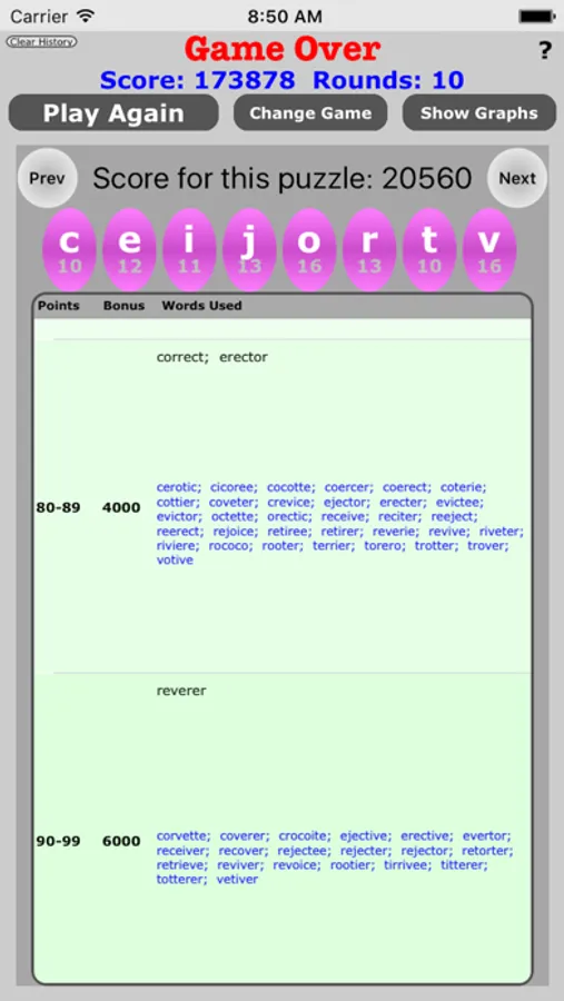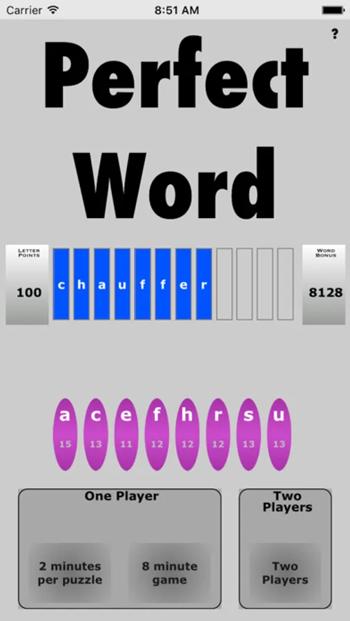 Perfect Word is a challenging game for one or two players in which the objective is to accumulate score by building words form from letter puzzles. A puzzle consists of eight letters with point values. Each valid word found in a puzzle earns the sum of the point values of each letter and a bonus based on how close the word is to perfect. Finding valid words in a puzzle usually easy; finding perfect words is hard.