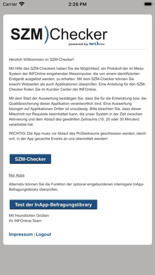 Mit der SZM-Checker App bietet INFOnline registrierten Nutzern die Möglichkeit, die im SZM System eingehenden App-Nutzungsdaten Ihres Endgerätes als Protkolldatei anzufordern. Der SZM-Checker dient zur Unterstützung und Verifizierung der Integration der SZM Library in Ihre Apps.