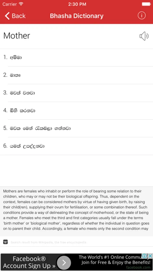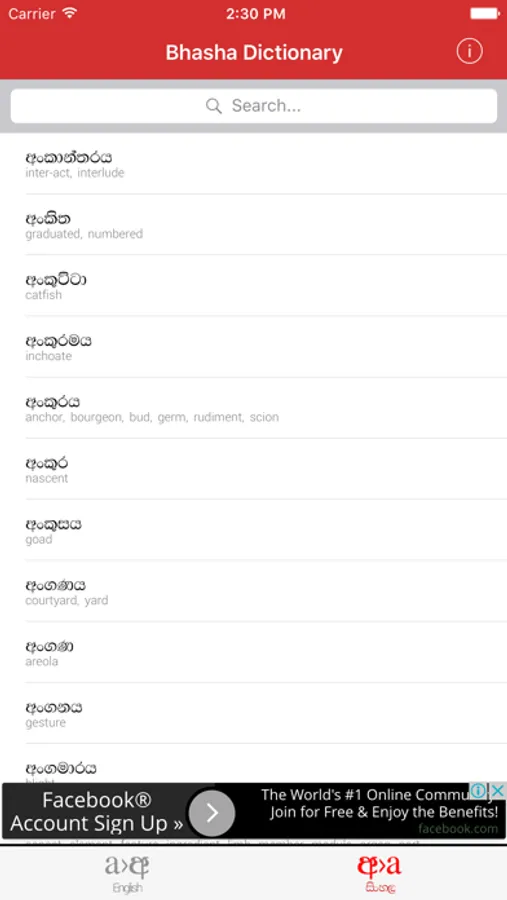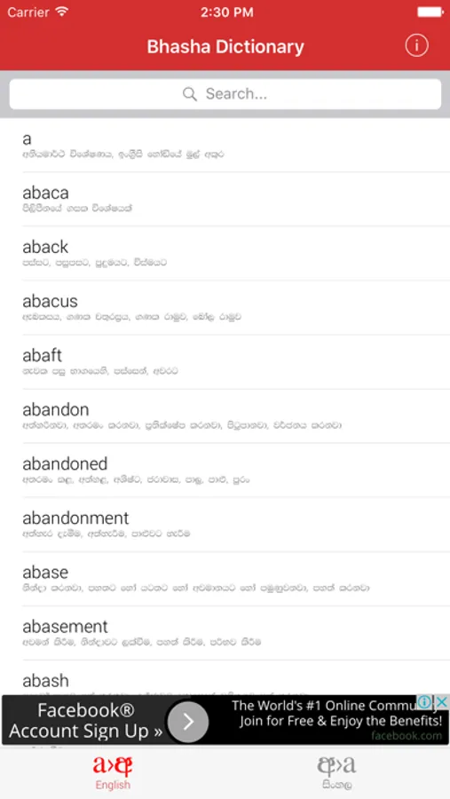 Bhasha English-Sinhala Dictionary provides you offline dictionary service for English to Sinhala word translations where you do not need any Internet connection to use the dictionary.